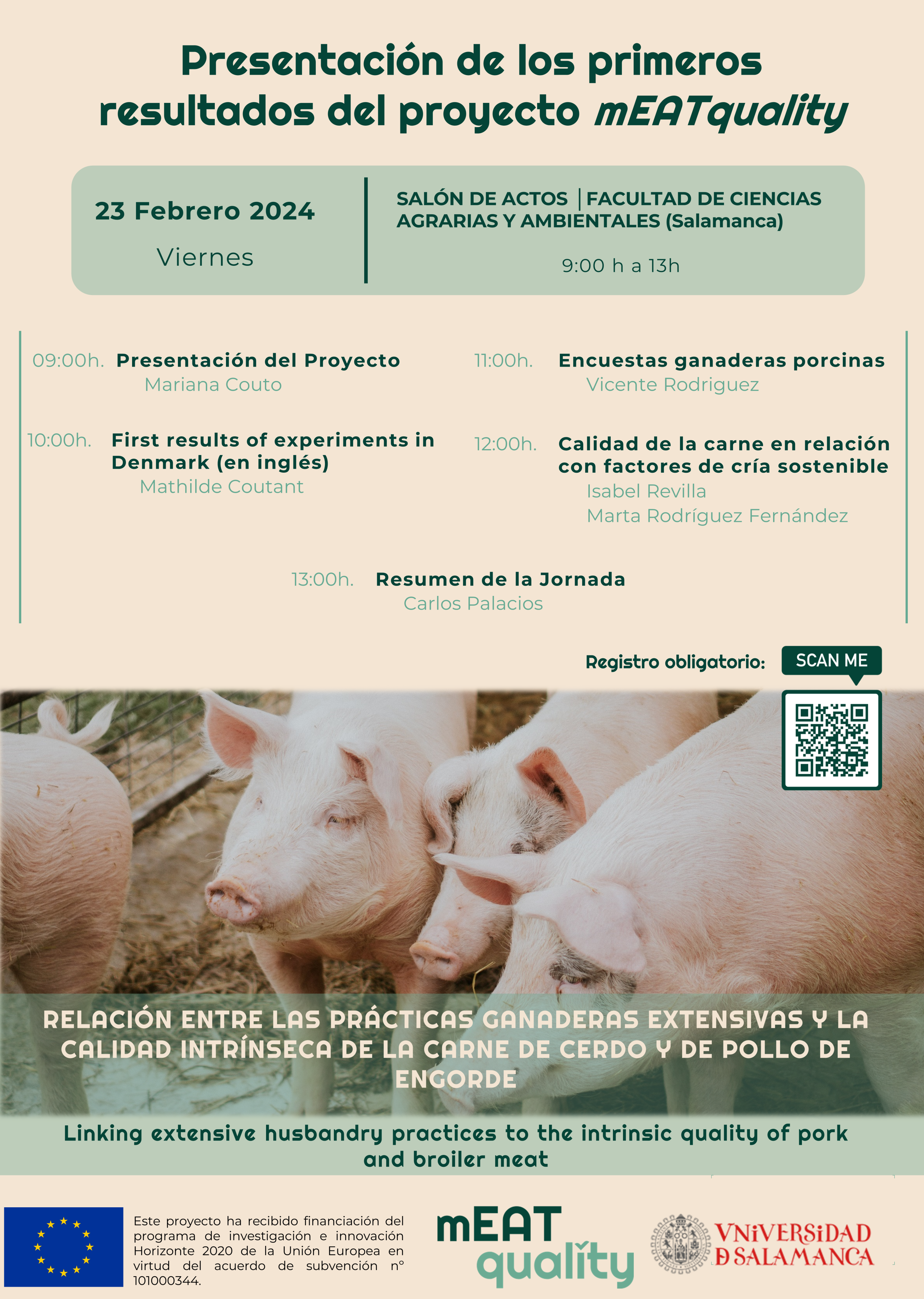 La presentación de los primeros resultados del proyecto mEATquality del Paquete de Trabajo 1 (Cerdos) tendrá lugar el viernes 23 de febrero, de 09h a 14h en Salamanca.