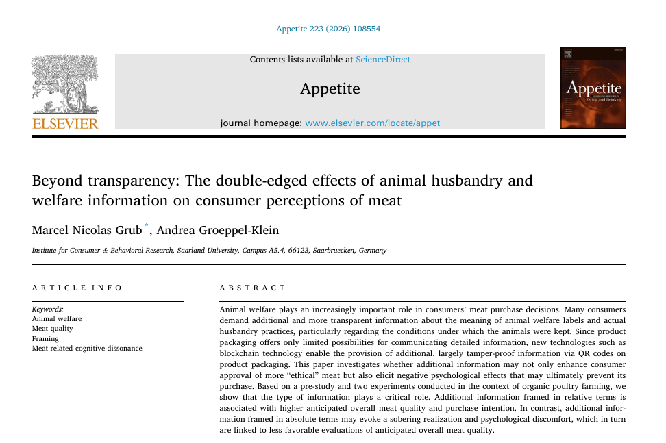 2023: Blockchain encryption of supply chains and animal welfare cues and their impact on consumers’ assessment of high-quality meat.